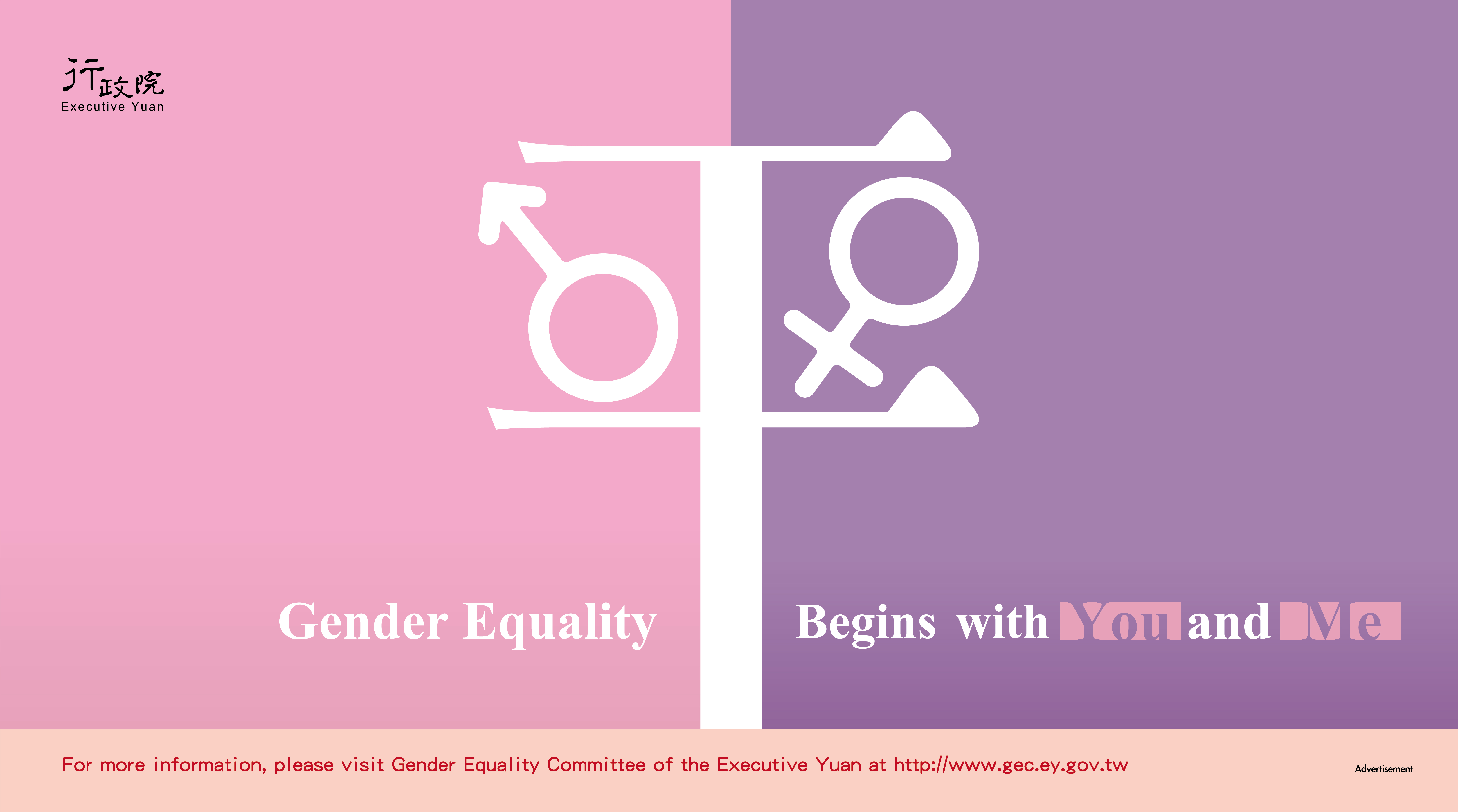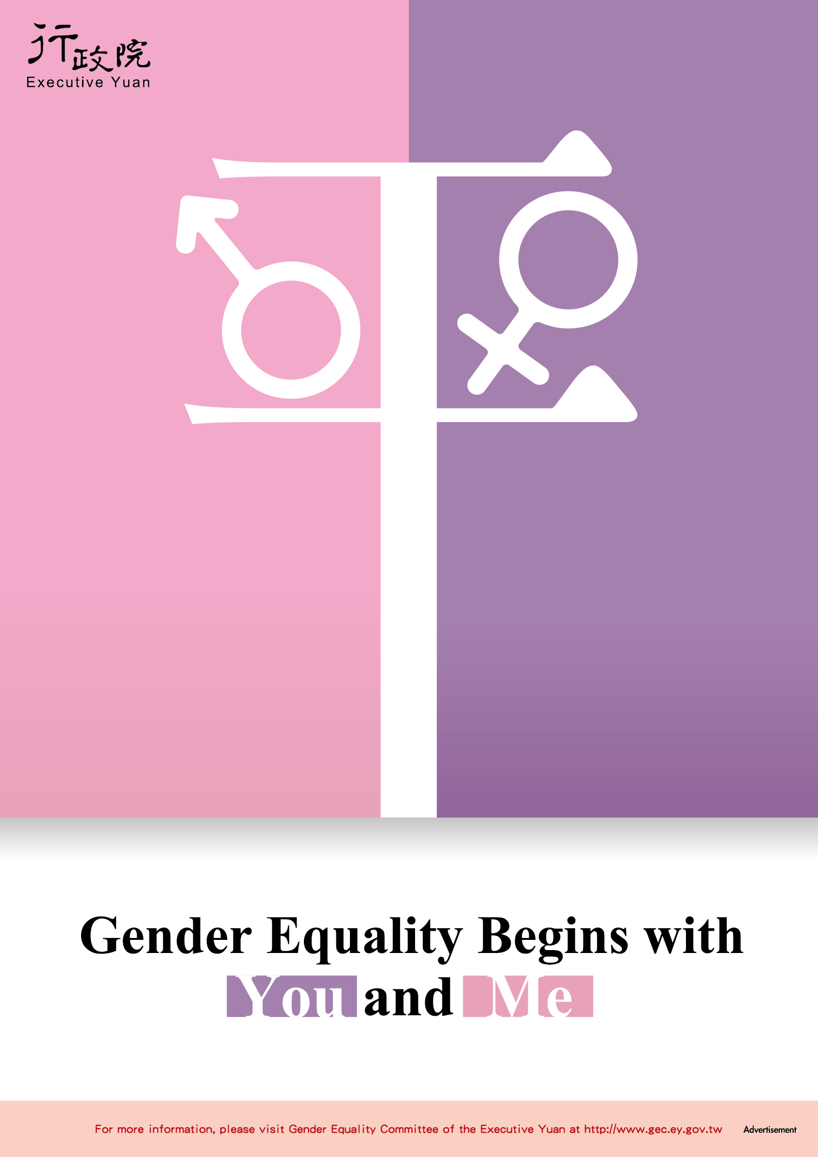 - 「平字版」:整體視覺設計為現代簡約風格,以平字結合性別的符號設計,直接的傳遞男女平等概念。“性別平等”是需要你我間互助、包容與尊重才能逐漸的實現與達成的。主標題直接以開門見山的方式,破題出宣導議題的重點需「從你我做起」,藉此喚起民眾的行動力與執行力,使議題發揮其效益。